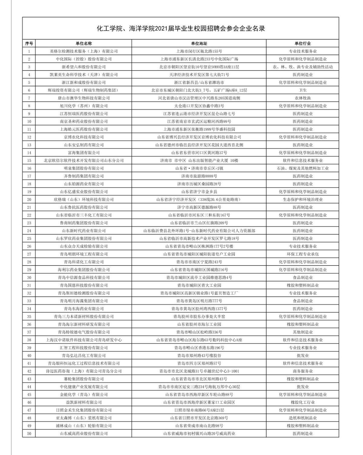 感謝對(duì)海洋學(xué)院、化工學(xué)院就業(yè)工作的長期關(guān)注與支持!為更好地為廣大用人單位和畢業(yè)生搭建雙向選擇的平臺(tái),學(xué)院邀請了90家化工、醫(yī)藥、生命科學(xué)、海洋類企業(yè)單位(附參會(huì)名單),于3月30日下午舉辦“匯智共贏,直通名企”2021屆畢業(yè)生校園專場招聘會(huì)。