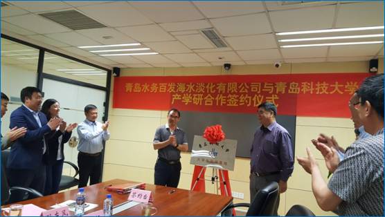 2017年5月18日下午我院與青島水務(wù)海潤自來水集團公司在青島百發(fā)海水淡化有限公司簽訂產(chǎn)學(xué)研合作協(xié)議。青島科技大學(xué)海洋學(xué)院院長陳夫山和青島水務(wù)海潤自來水集團公司總經(jīng)理孫東風(fēng)在會上發(fā)言并在協(xié)議書上簽字。青島市城市管理局副局長孫煒出席并講話。出席簽字儀式的還有青島科技大學(xué)海洋學(xué)院副院長范金石、生物質(zhì)資源系系主任張恒、青島百發(fā)海水淡化公司總經(jīng)理張曉東、青島海潤自來水集團公司綜合部部長呂思東和青島百發(fā)海水淡化公司行政部經(jīng)理張海艷等領(lǐng)導(dǎo)。簽字儀式后雙方代表參觀了青島百發(fā)海水淡化廠。
