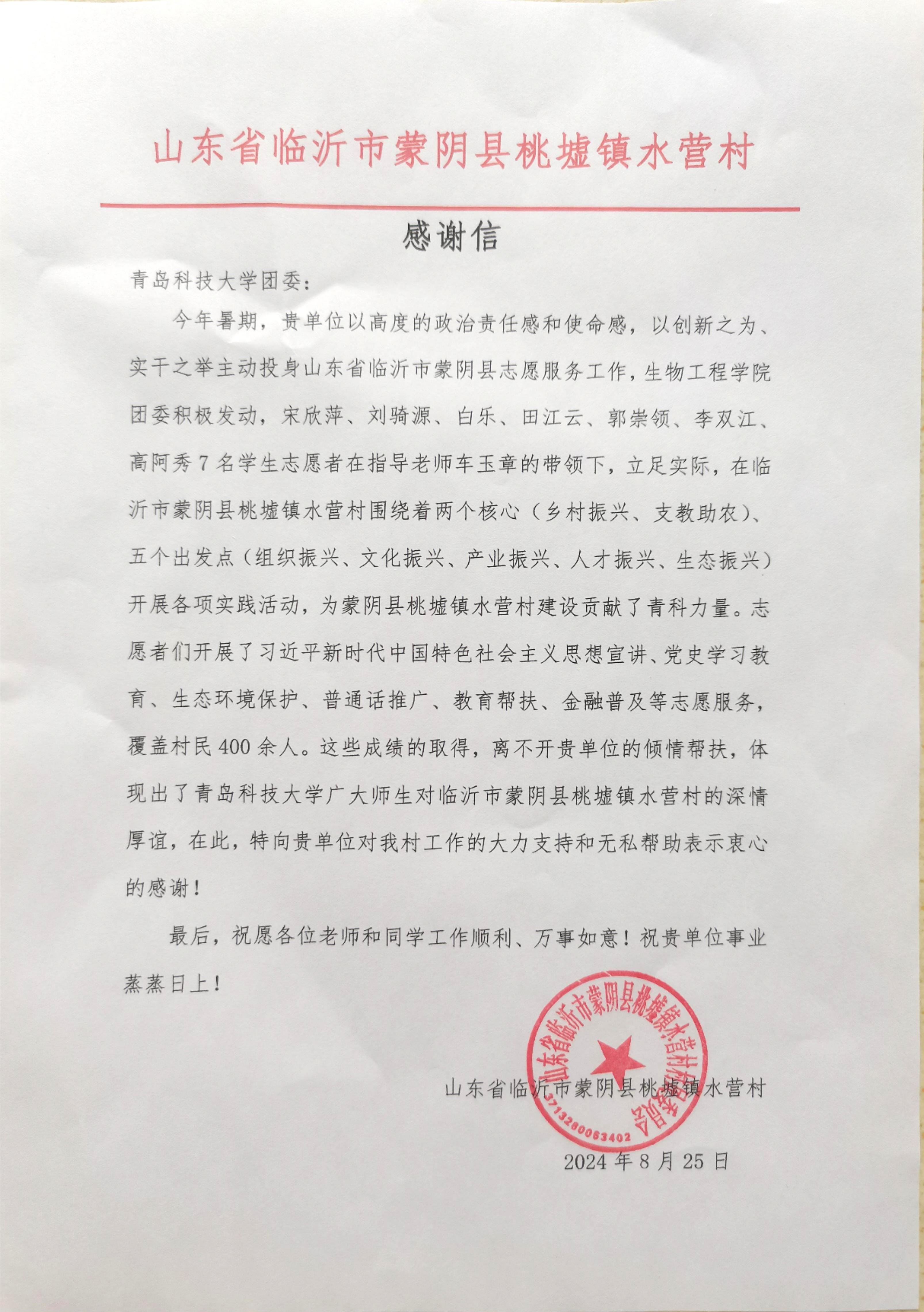 為深入學習貫徹習近平新時代中國特色社會主義思想和黨的二十大精神,學習習近平總書記五四青年節(jié)對全國廣大青年寄語精神,通過社會實踐堅定理想信念、站穩(wěn)人民立場、練就過硬本領、投身強國偉業(yè),7月19日至7月28日,生物工程學院“山海情”調(diào)研團赴臨沂市蒙陰縣開展暑期社會實踐活動。活動過程中,團隊成員的優(yōu)秀表現(xiàn)得到了山東省臨沂市蒙陰縣桃墟鎮(zhèn)水營村的高度贊揚,并發(fā)來感謝信。
