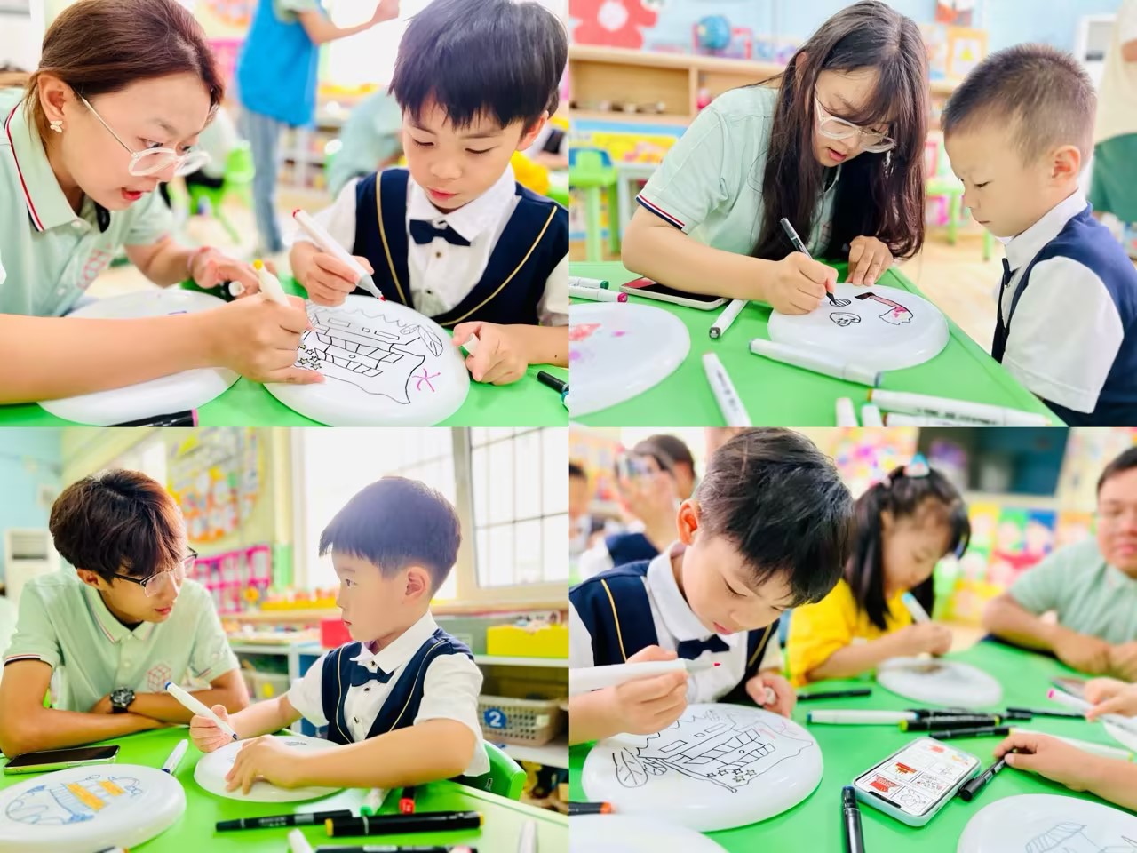 活動(dòng)現(xiàn)場(chǎng),同學(xué)們?yōu)槊课恍∨笥逊职l(fā)了空白飛盤以及繪畫彩筆,讓小朋友們發(fā)揮想象力,以空白飛盤為載體作畫,發(fā)揮小朋友天馬行空的想象力,繪制國(guó)慶元素,創(chuàng)造出屬于自己的國(guó)慶限定飛盤。參加活動(dòng)的小朋友選擇了不同的圖案,將自己對(duì)祖國(guó)的熱愛以獨(dú)特的方式呈現(xiàn)在了飛盤上。制作過程小朋友們?nèi)褙炞ⅲW(xué)子在旁協(xié)助,大家一起為原本空白飛盤增添上豐富的元素。隨后帶領(lǐng)小朋友在草坪上體驗(yàn)了飛盤放飛活動(dòng),讓大家感受到體育運(yùn)動(dòng)的快樂。