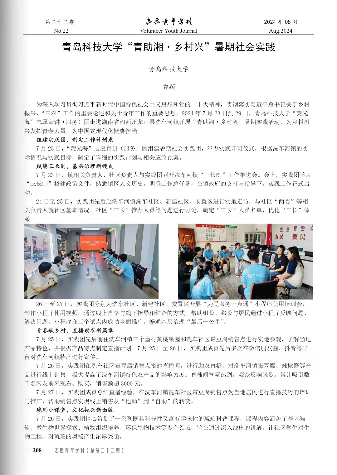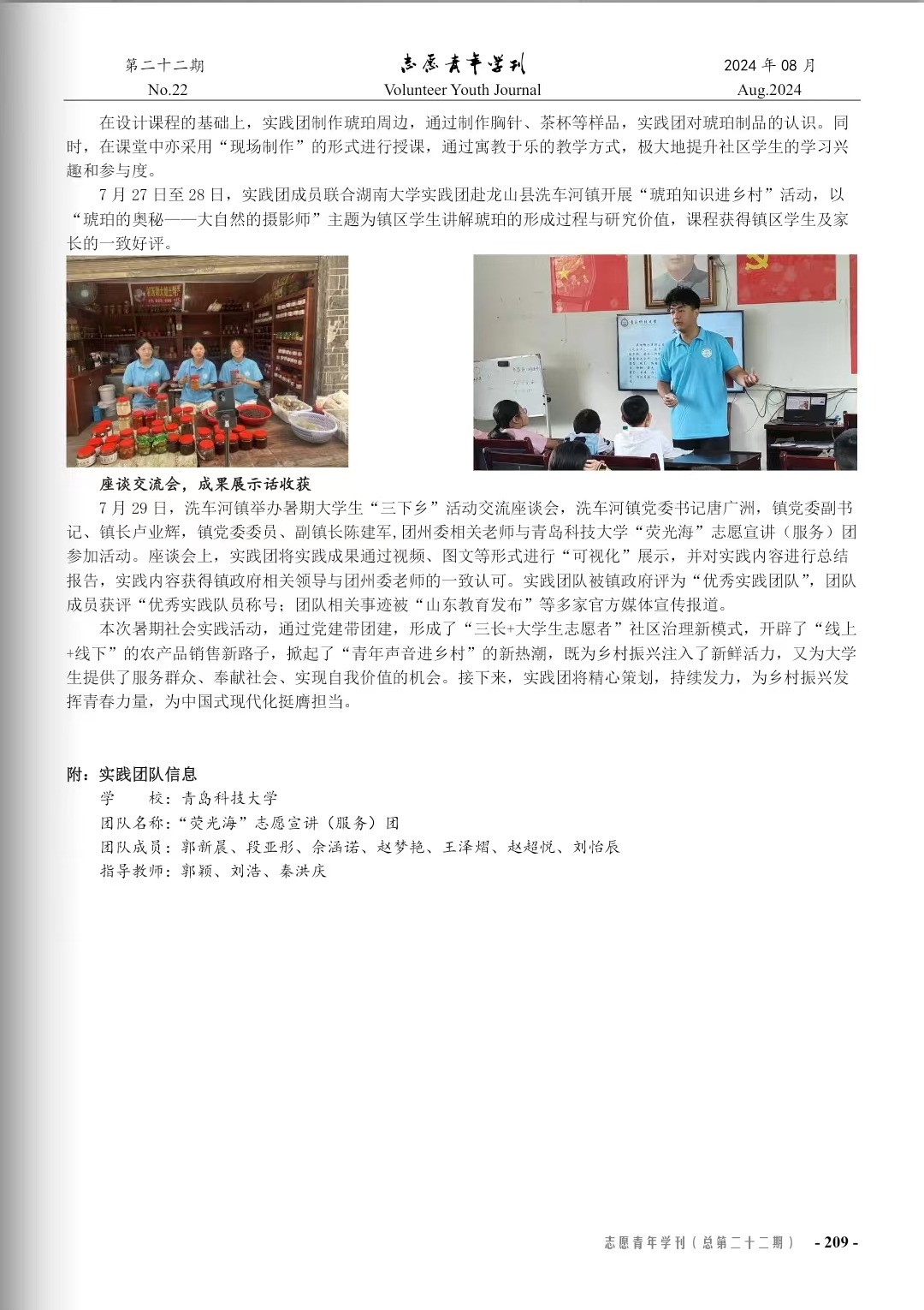 近期,由《志愿青年學(xué)刊》編輯部開(kāi)展的2024年暑期“三下鄉(xiāng)”社會(huì)實(shí)踐專(zhuān)刊(上輯-活動(dòng)紀(jì)實(shí);2024年8月刊;總第二十二期)征稿審稿錄用工作已完成。生物工程學(xué)院由劉浩、秦洪慶、郭穎老師指導(dǎo)的《青島科技大學(xué)“青助湘·鄉(xiāng)村興”暑期社會(huì)實(shí)踐》一文通過(guò)編委會(huì)審核,已于《志愿青年學(xué)刊》2024年暑期“三下鄉(xiāng)”社會(huì)實(shí)踐專(zhuān)刊(上輯-活動(dòng)紀(jì)實(shí))發(fā)表。