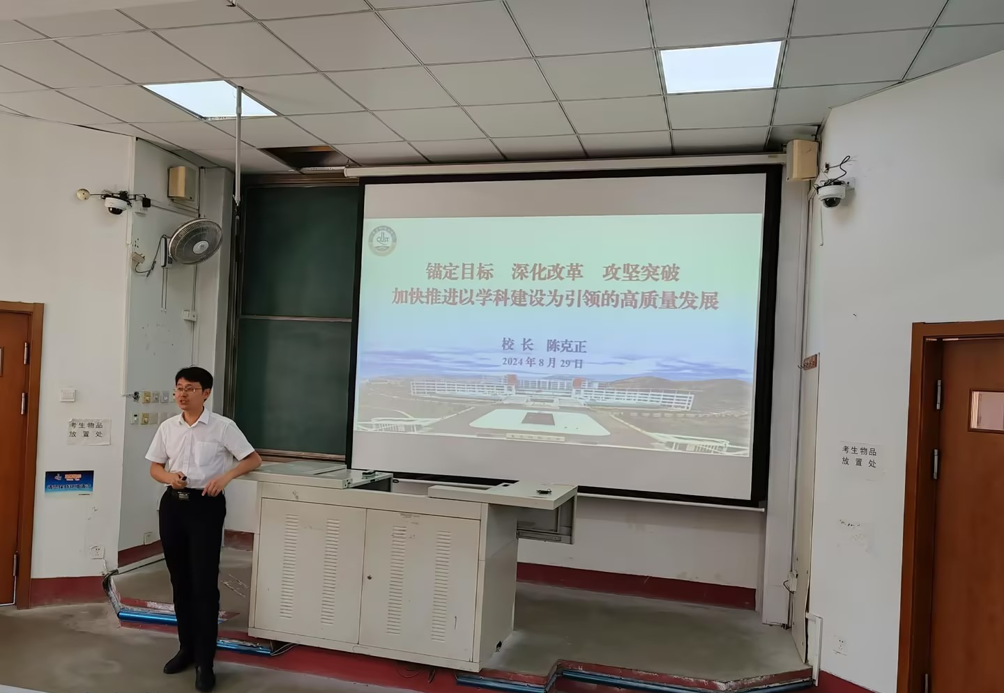 顧玉超結(jié)合學校學科建設(shè)高質(zhì)量發(fā)展目標,以《奮進新征程勇?lián)率姑窞轭},介紹了黨的二十屆三中全會精神,帶領(lǐng)同學們學習了《中共中央關(guān)于進一步全面深化改革、推進中國式現(xiàn)代化的決定》,他指出,黨的二十屆三中全會為新征程上的進一步全面深化改革指明了方向、提供了根本遵循,希望全院學生能夠以此學習為契機,堅定不移聽黨話、跟黨走,爭做有理想、敢擔當、能吃苦、肯奮斗的新時代好青年,在推進強國建設(shè)、民族復興偉業(yè)中展現(xiàn)青春作為、彰顯青春風采、貢獻青春力量,奮力書寫為中國式現(xiàn)代化挺膺擔當?shù)那啻浩隆?/p>