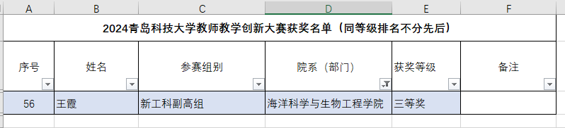 根據(jù)學校2024年教師教學創(chuàng)新大賽工作安排,學校于近期組織開展了比賽評選工作。經(jīng)個人申報,學院審核推薦,專家評審,本科教學工作委員會審議,最終確定53人獲獎,其中一等獎12名,二等獎20名,三等獎21名。海洋學院王霞老師獲青島科技大學教師教學創(chuàng)新大賽三等獎。