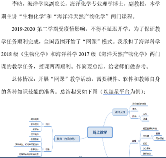 在線上教學試行一段時間之后,各位教師對近期的教學情況做了總結分析。針對教學過程中出現(xiàn)的問題,老師們加強與教學團隊成員之間的聯(lián)系,積極探討問題所在,并不斷改良教學思路,探索新的教學方式:李昉老師(海洋學院副院長、副教授,主講“生物化學”和“海洋洋天然產(chǎn)物化學”兩門課程)針對教學期間存在的網(wǎng)絡問題,將自己的課程做成短視頻上傳至教學平臺,讓學生進行自主學習,并集中進行線上答疑;史振平老師(講師,主講“生物化學”)為提高學生的學習效率、保證每位同學有所收獲,不斷創(chuàng)新自己的講課方式,并增加了線上提問、線下互動等環(huán)節(jié),來提高學生學習的積極性;在當下特殊的疫情情況下,教學工作面臨巨大挑戰(zhàn),對此,王霞老師(海洋學院副教授,主講“酶工程專業(yè)”)也表示,“疫情總會過去,春暖總會花開。特殊時期,每一個人的付出和努力都是必不可少的。作為一名大學教師,我將秉承自己的職責,繼續(xù)做好與學生之間溝通的橋梁,與學生們共同進步”;王新萍老師(講師,主講“化學品安全與健康”)特別推出了“抗疫我有責,科學幫助我!”小課堂,提前錄制微課上傳智慧樹教學平臺,利用課前5分鐘,向同學們傳遞科學防控的 小知識,幫助大家科學抗擊疫情。