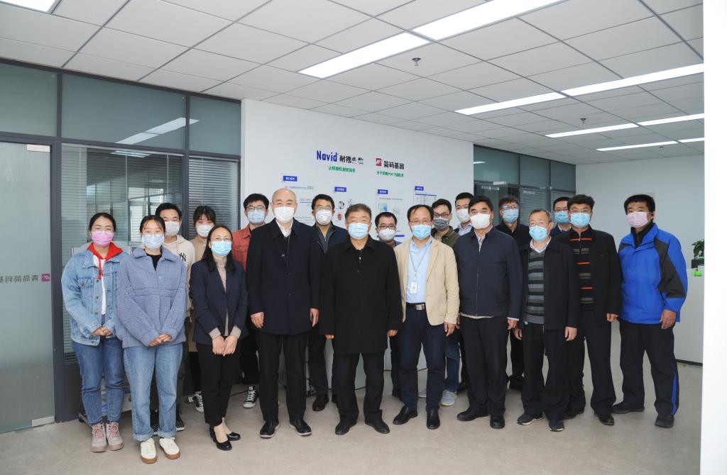 簡碼基因科技有限公司總經(jīng)理董雪峰匯報了新冠病毒核酸檢測試劑盒項目的進展情況。會后,校領導與參與研發(fā)活動的師生合影留念。