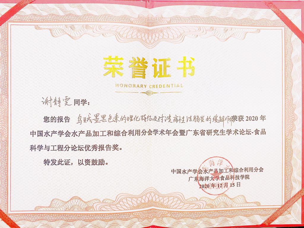 2020年12月14-16日,由中國水產(chǎn)學(xué)會水產(chǎn)品加工與綜合利用分會主辦,廣東海洋大學(xué)承辦的“2020年中國水產(chǎn)學(xué)會水產(chǎn)品加工與綜合利用分會學(xué)術(shù)年會”在廣東湛江隆重召開。年會以“藍(lán)色、營養(yǎng)、安全、健康”為主題。會議設(shè)置特邀專家報(bào)告、特邀青年學(xué)者報(bào)告、專題報(bào)告和研究生論壇,參加單位87家,參會嘉賓500余人,共同探討水產(chǎn)品加工與安全控制的前沿技術(shù)與發(fā)展趨勢,增強(qiáng)水產(chǎn)品加工科技自主創(chuàng)新能力,促進(jìn)我國水產(chǎn)加工產(chǎn)業(yè)的轉(zhuǎn)型升級和持續(xù)發(fā)展。此次會議的研究生論壇共推選125名研究生進(jìn)行論壇交流,我院輕工技術(shù)與工程2019級碩士研究生謝靜雯同學(xué)的報(bào)告“烏賊墨黑色素的理化特征及對潰瘍性結(jié)腸炎的緩解作用”成為此次評選出的15名優(yōu)秀報(bào)告獎之一。