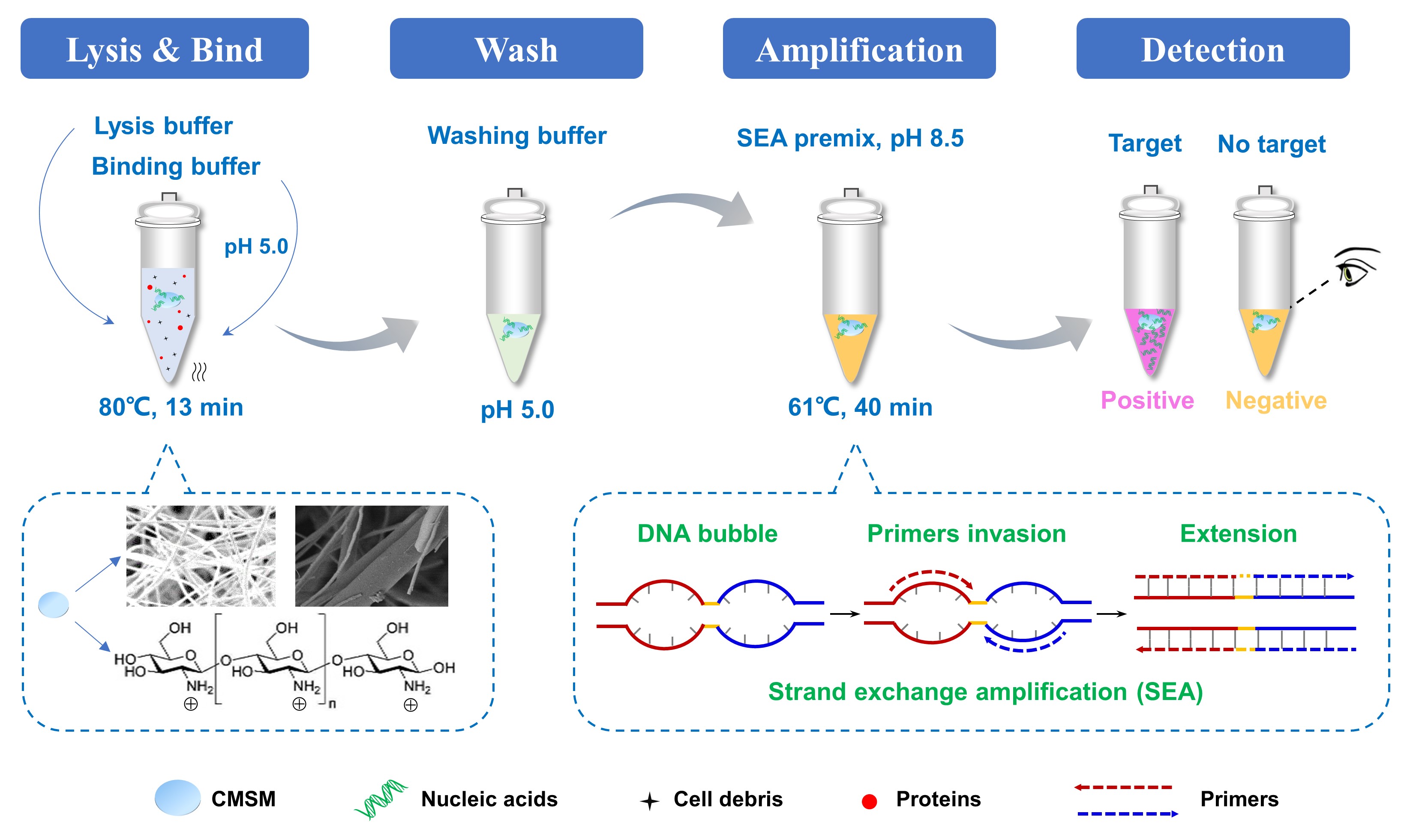 單增李斯特菌是一種重要的人畜共患食源性致病菌。該菌廣泛存在于多種食品中,如肉制品、奶制品、水產(chǎn)品等,如何有效控制食品中的單增李斯特菌,是食品安全的重要任務(wù),其中快速、準(zhǔn)確的檢測(cè)技術(shù)是關(guān)鍵手段之一。在課題組前期自主研發(fā)的基于變性泡介導(dǎo)的等溫鏈交換擴(kuò)增(SEA)技術(shù)的基礎(chǔ)上,本研究報(bào)道了一種將核酸提取、擴(kuò)增和可視化檢測(cè)于一管中的單增李斯特菌一體化檢測(cè)平臺(tái)。在簡(jiǎn)單的細(xì)菌裂解后,釋放的DNA和RNA被殼聚糖改性的二氧化硅膜(CMSM)提取和富集,然后將吸附核酸的CMSM直接用于后續(xù)擴(kuò)增和比色檢測(cè)。該平臺(tái)對(duì)于純培養(yǎng)單增李斯特菌的檢測(cè)限為1.0×102 CFU/mL,而對(duì)于豬肉中單增李斯特菌的檢測(cè)限為1.0×103 CFU/g,經(jīng)過4小時(shí)增菌后檢測(cè)限可以達(dá)到1.0×100 CFU/g。整個(gè)檢測(cè)流程僅需一小時(shí),其檢測(cè)靈敏度達(dá)到市場(chǎng)檢測(cè)需求。此外,研究中開發(fā)的基于比色的可視化結(jié)果判讀完全省略了復(fù)雜設(shè)備的使用。因此,該平臺(tái)具有在資源受限環(huán)境中快速和現(xiàn)場(chǎng)鑒定單增李斯特菌的巨大潛力。