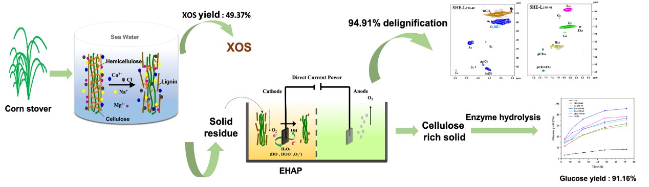 在此基礎(chǔ)上,該團(tuán)隊提出了一種新穎的海水水熱-電催化兩步預(yù)處理技術(shù),基于半纖維素優(yōu)先策略實現(xiàn)了秸稈全組分的精準(zhǔn)拆解與高效轉(zhuǎn)化,同時制備低聚糖、可發(fā)酵性糖和小分子量木質(zhì)素化合物,并揭示了主要組分的降解轉(zhuǎn)化機(jī)制。相關(guān)研究成果以“Promising seawater hydrothermal combining electro-assisted pretreatment for corn stover valorization within a biorefinery concept”為題目,發(fā)表在生物質(zhì)領(lǐng)域國際知名期刊Bioresource Technology (Bioresource Technol. 2022, 351:127066. IF= 11.889,中科院一區(qū)TOP期刊)。論文第一作者為海洋學(xué)院碩士研究生吳越,通訊作者為吉喆副教授,青島科技大學(xué)為第一單位和唯一通訊單位。該項工作得到了國家自然科學(xué)基金、山東省重大創(chuàng)新工程的資助。