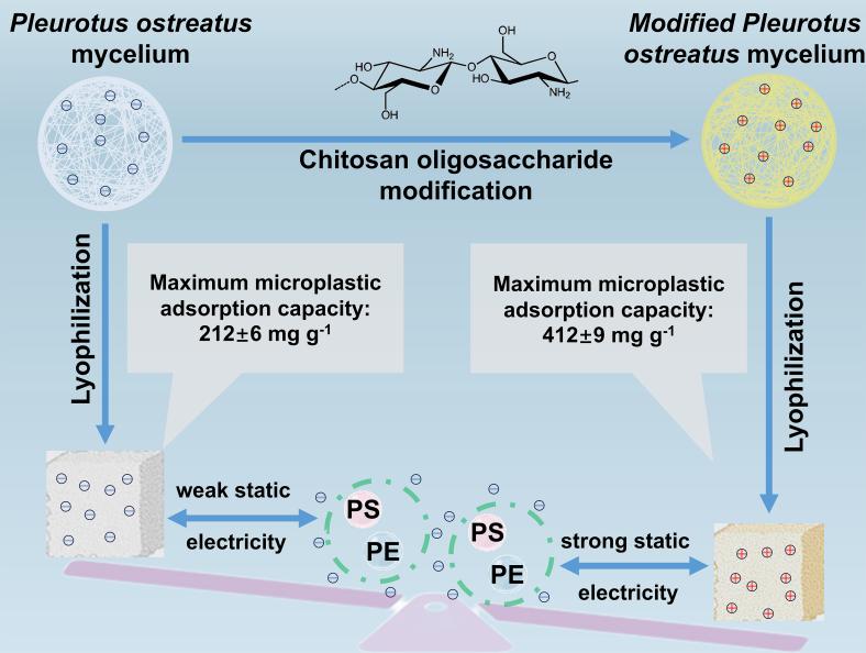 針對水中微塑料的治理難題,團(tuán)隊創(chuàng)新性地提出了一種基于改性可食用真菌平菇的去除方法,選用綠色可食、經(jīng)濟(jì)易得的平菇菌絲體構(gòu)建微塑料去除框架,以天然物質(zhì)殼聚糖和檸檬酸對其改性,得到改性菌絲體(M-PM)海綿。1 g M-PM可去除412.42±9.14 mg MPs,常溫下,其對自來水樣品中MPs的去除率高達(dá)68.8%,對其他水樣的去除率也可達(dá)60.1%~67.4%。該材料的優(yōu)異性能主要源于內(nèi)部的結(jié)構(gòu)交聯(lián)與表面的陽離子化修飾。此外,M-PM具備良好的生物相容性,整個制備和使用過程綠色無污染。相關(guān)研究成果以題為《Chitosan oligosaccharide-modified Pleurotus ostreatus mycelium for microplastic removal based on the green design concept》的論文,發(fā)表于國際期刊《Industrial Crops and Products》(JCR一區(qū),IF=6.2)。論文第一作者為生物工程學(xué)院碩士研究生董新睿,青島科技大學(xué)為第一單位,通訊作者為王霞副教授。