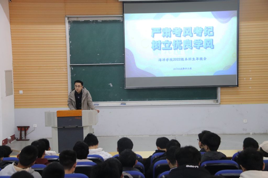 期末考試臨近,為幫助同學(xué)們樹立誠信考試意識,加強(qiáng)我院學(xué)風(fēng)考風(fēng)建設(shè),宣傳誠信應(yīng)考,深化誠信教育,切實(shí)提升同學(xué)們的誠信品質(zhì)和集體榮譽(yù)感,12月8日,海洋學(xué)院于二教101組織召開2022級本科生期末考試誠信教育主題年級大會,22級輔導(dǎo)員車玉章老師主持會議,22級全體本科生參加本次會議。