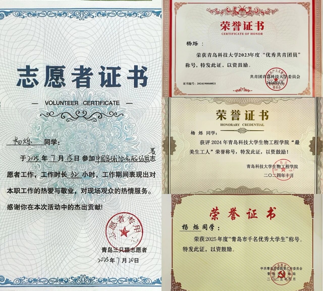 獲2025年度“青島市千名優(yōu)秀大學生”、2023年度青島科技大學五四先進個人、校級優(yōu)秀學生、校級優(yōu)秀共青團員、2024年青島科技大學生物工程學院“最美生工人”等榮譽稱號數(shù)項。