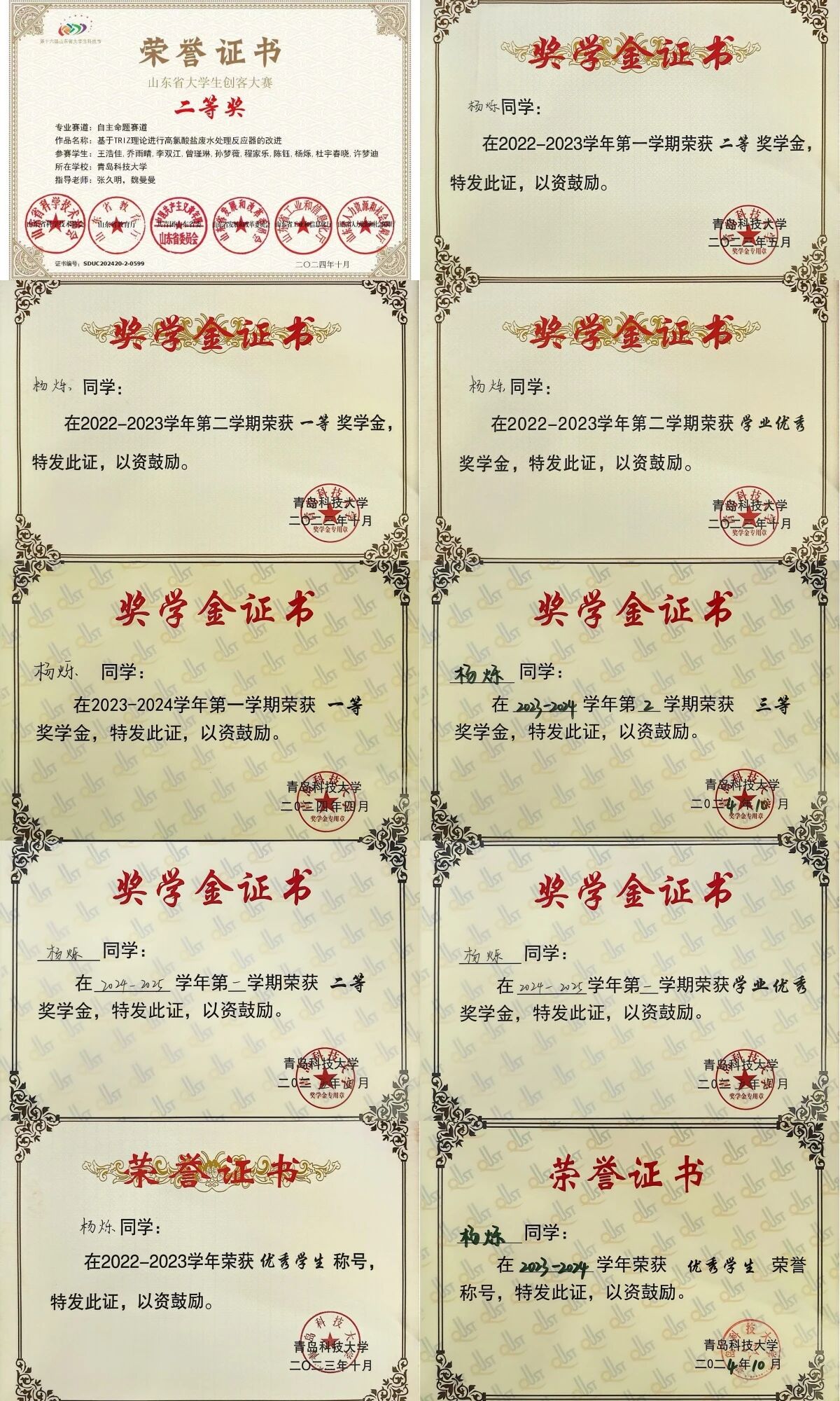 獲一等綜合獎學金、二等綜合獎學金、三等綜合獎學金、學業(yè)優(yōu)秀獎學金等獎勵十余項;