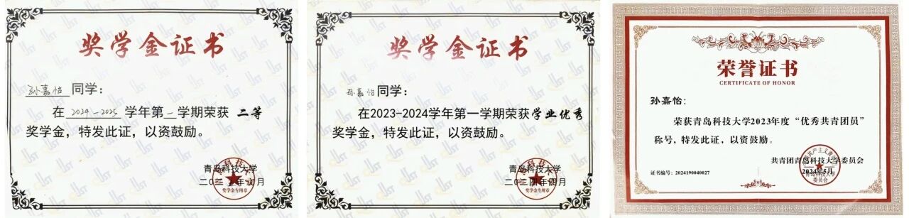 青島科技大學(xué)校二等獎學(xué)金兩次,青島科技大學(xué)社會實踐獎學(xué)金一次,青島科技大學(xué)學(xué)業(yè)優(yōu)秀獎學(xué)金一次,優(yōu)秀共青團(tuán)員一次。