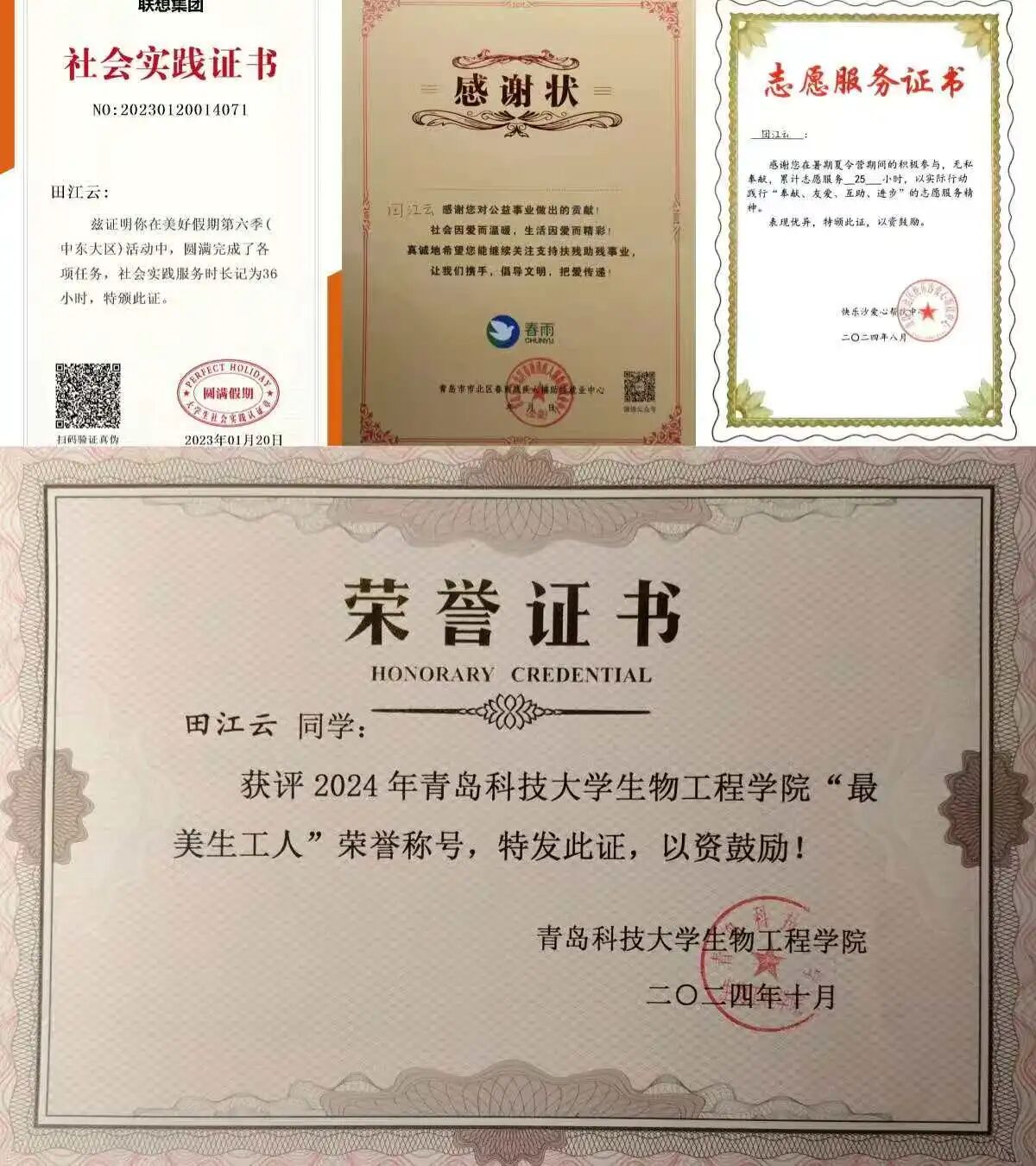 獲校級(jí)優(yōu)秀學(xué)生、校級(jí)優(yōu)秀學(xué)生干部、校級(jí)優(yōu)秀青年志愿者、校級(jí)社會(huì)實(shí)踐優(yōu)秀學(xué)生、最美生工人等榮譽(yù)稱號(hào);