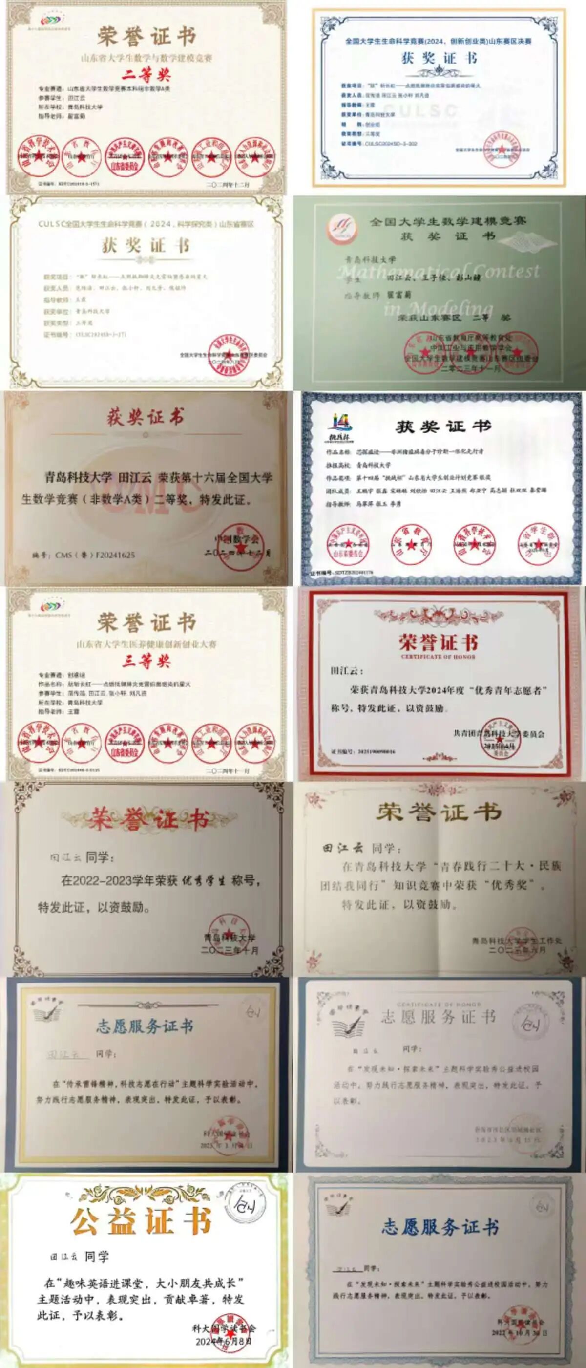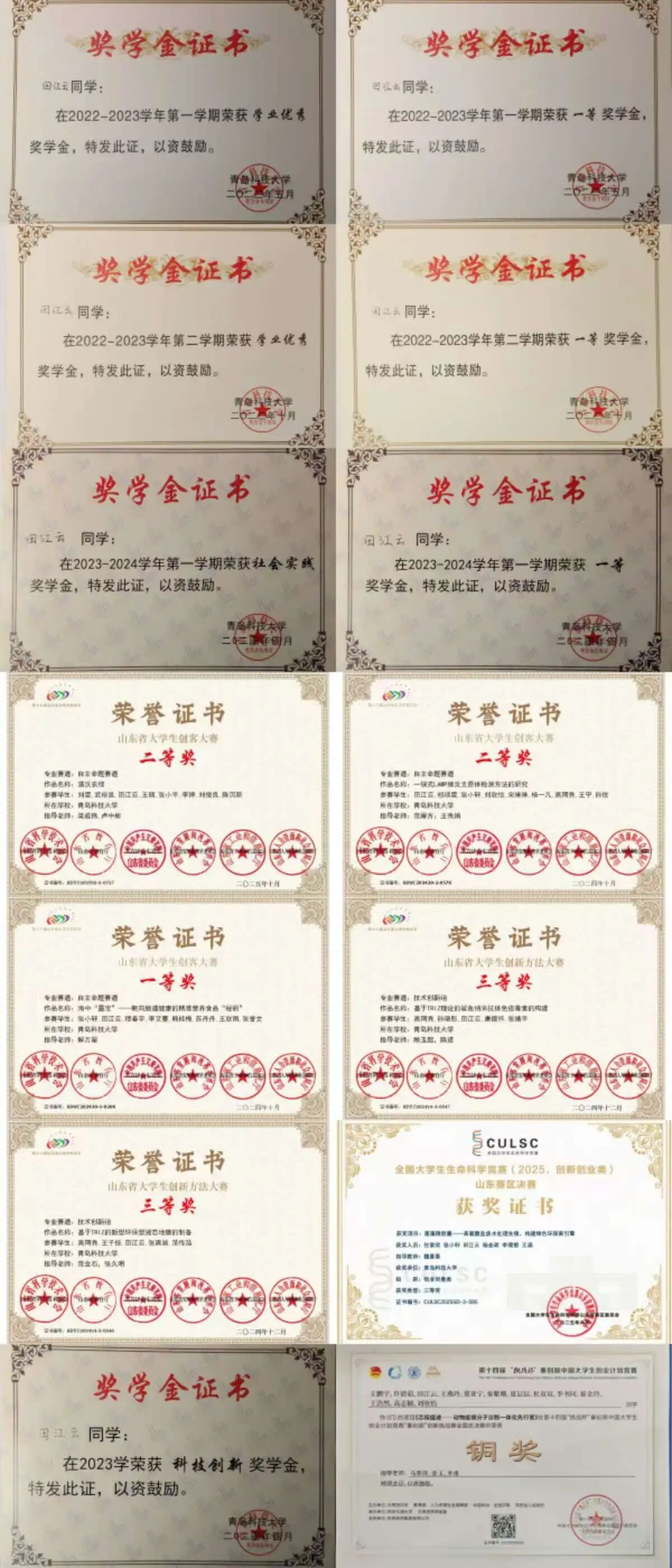 榮獲“挑戰(zhàn)杯”秦創(chuàng)原創(chuàng)新挑戰(zhàn)賽國家級(jí)銅獎(jiǎng)、全國大學(xué)生數(shù)學(xué)競(jìng)賽國家級(jí)二等獎(jiǎng)、全國大學(xué)生數(shù)學(xué)建模競(jìng)賽省級(jí)二等獎(jiǎng)、中國國際大學(xué)生創(chuàng)新大賽省級(jí)銅獎(jiǎng)、第十四屆“挑戰(zhàn)杯”大學(xué)生創(chuàng)業(yè)計(jì)劃競(jìng)賽主賽道省級(jí)銀獎(jiǎng)、山東省大學(xué)生醫(yī)養(yǎng)健康創(chuàng)新創(chuàng)業(yè)大賽三等獎(jiǎng)、山東省大學(xué)生創(chuàng)客大賽一等獎(jiǎng),二等獎(jiǎng)、第九屆全國大學(xué)生生命科學(xué)競(jìng)賽(科學(xué)探究類)省級(jí)三等獎(jiǎng)、山東省大學(xué)生創(chuàng)新方法大賽三等獎(jiǎng)、第十屆全國大學(xué)生生命科學(xué)競(jìng)賽(創(chuàng)新創(chuàng)業(yè)類)省級(jí)三等獎(jiǎng)、2024年大學(xué)生創(chuàng)新創(chuàng)業(yè)訓(xùn)練項(xiàng)目省級(jí)立項(xiàng)(負(fù)責(zé)人)等。