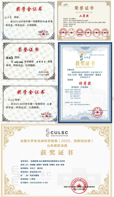 榮獲第九屆山東省大學(xué)生創(chuàng)客大賽省二等獎(jiǎng)、第十屆生命科學(xué)競(jìng)賽大賽省級(jí)三等獎(jiǎng)、第十五屆全國大學(xué)生電子商務(wù)三創(chuàng)賽校特等獎(jiǎng);獲團(tuán)委青年媒體工作室“優(yōu)秀攝影獎(jiǎng)”、校級(jí)二等綜合獎(jiǎng)學(xué)金、社會(huì)實(shí)踐獎(jiǎng)學(xué)金、優(yōu)秀學(xué)生稱號(hào)等。