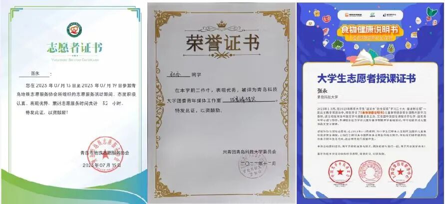 她積極參與志愿活動(dòng),注重在實(shí)踐中增長才干。積極參與“返家鄉(xiāng)”社會(huì)實(shí)踐、青島歡樂濱海馬拉松、青島地鐵志愿服務(wù)、“一起云支教”、“悅讀”書屋、“海創(chuàng)匯”、“小浪花”青年志愿服務(wù)隊(duì)等志愿服務(wù)十余項(xiàng),累計(jì)服務(wù)時(shí)長超400小時(shí)。這些經(jīng)歷不僅豐富了她的閱歷,也鍛煉了她的溝通協(xié)調(diào)、組織執(zhí)行等多方面能力。