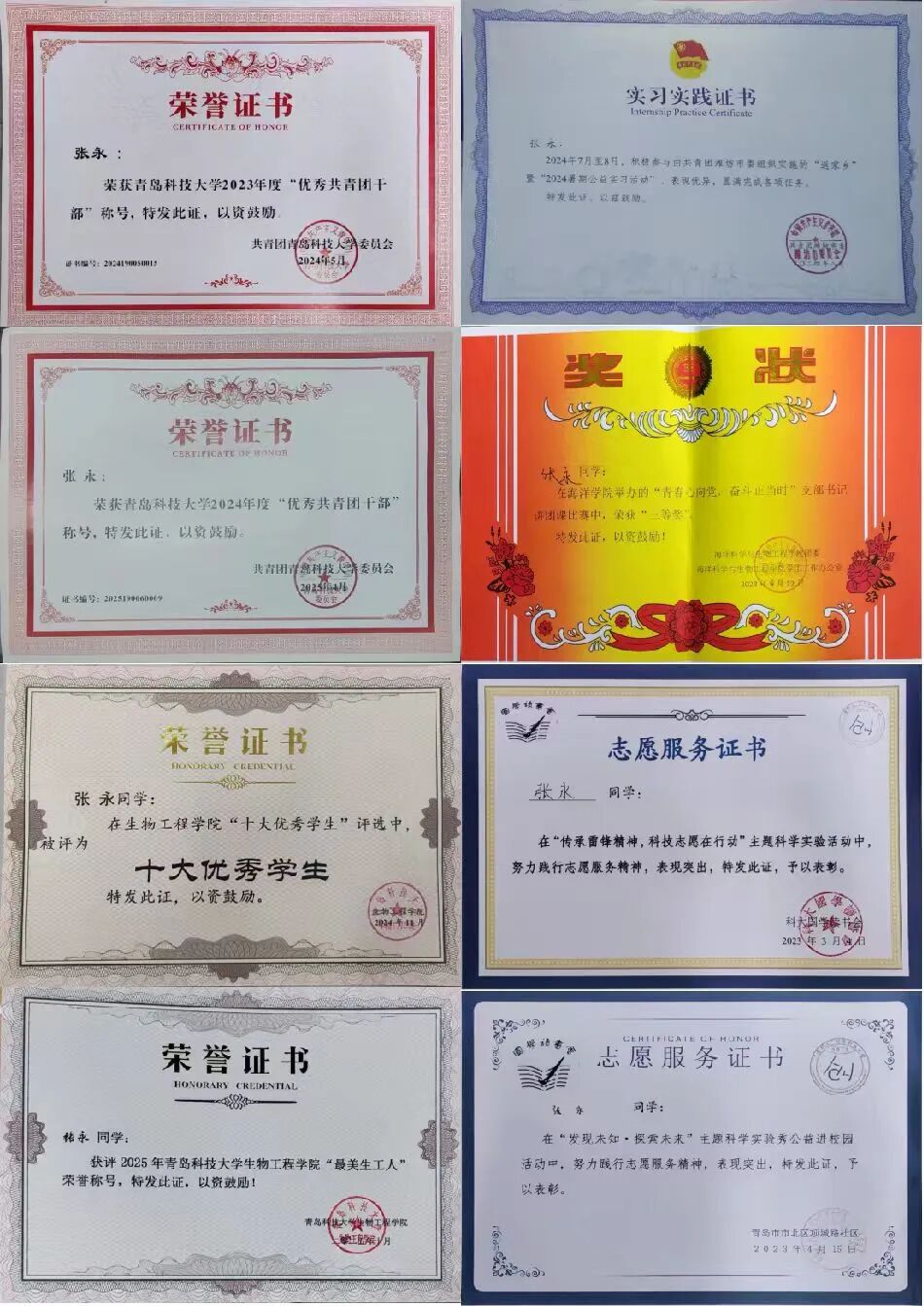 榮獲校“優(yōu)秀學(xué)生干部”稱號(hào)3次、校2023年度“優(yōu)秀共青團(tuán)干部”和2024年度“優(yōu)秀共青團(tuán)干部”稱號(hào)各1次、院“十大優(yōu)秀學(xué)生”稱號(hào)、“最美生工人”稱號(hào);