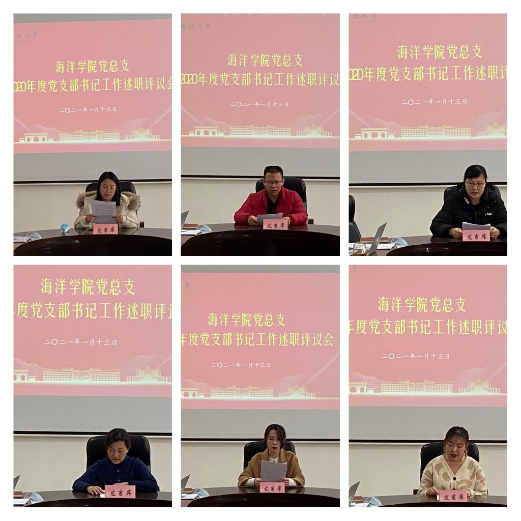會上,海洋學(xué)院6名黨支部書記先后從支部生活工作開展情況、支部工作成果、理論學(xué)習(xí)、存在不足、未來規(guī)劃等方面進(jìn)行工作述職,詳細(xì)匯報(bào)了2020年度的工作情況、工作成果和“一支部一特色”開展情況,對工作中出現(xiàn)的問題和不足進(jìn)行自省并提出相應(yīng)的改進(jìn)措施。