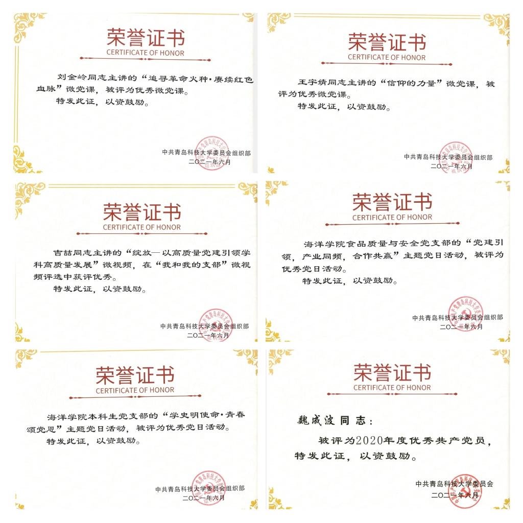 學(xué)院本科生黨支部書(shū)記劉金嶺主講的“追尋革命火種,賡續(xù)紅色血脈”微黨課、海洋科學(xué)黨支部王宇婧主講的“信仰的力量”微黨課獲評(píng)校“優(yōu)秀微黨課”,輕化工程黨支部書(shū)記吉喆主講的“綻放-以高質(zhì)量黨建引領(lǐng)學(xué)科高質(zhì)量發(fā)展”微視頻在“我和我的支部”微視頻評(píng)選中獲評(píng)優(yōu)秀,食品質(zhì)量與安全黨支部的“黨建引領(lǐng)、產(chǎn)業(yè)同頻、合作共贏”主題黨日活動(dòng)、本科生黨支部“學(xué)史明使命,青春頌黨恩”主題活動(dòng)獲評(píng)校“優(yōu)秀黨日活動(dòng)”,海洋科學(xué)專業(yè)學(xué)生魏成波黨獲評(píng)校“2020年度優(yōu)秀共產(chǎn)黨員”。