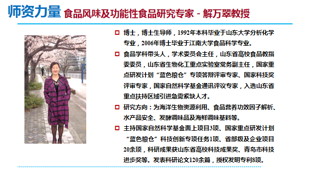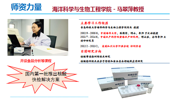 食品質(zhì)量與安全專業(yè)適應(yīng)當(dāng)前食品安全、食品營養(yǎng)與健康國家戰(zhàn)略發(fā)展需求,服務(wù)于山東區(qū)域經(jīng)濟(jì)社會(huì)發(fā)展,依托青島藍(lán)色硅谷海洋科技優(yōu)勢,在食品中生物危害物快速識(shí)別與檢測、海洋食品營養(yǎng)品質(zhì)高值化利用等科技創(chuàng)新成果高效轉(zhuǎn)化方面優(yōu)勢特色明顯。先后獲批青島市核酸快檢工程研究中心、青島市海洋生物活性物質(zhì)與精準(zhǔn)營養(yǎng)食品工程研究中心和青島市海洋生物活性因子健康食品工程技術(shù)協(xié)同中心等科研平臺(tái)。馬翠萍教授團(tuán)隊(duì)研發(fā)的食品核酸檢測試劑盒在北京冬奧會(huì)食品安全檢測項(xiàng)目中中標(biāo),為北京2022年冬奧會(huì)食品安全環(huán)節(jié)提供了科學(xué)保障和有力支持。
