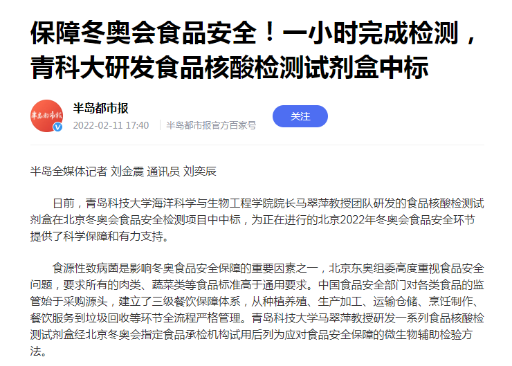 食品核酸檢測試劑盒中標(biāo)北京冬奧會(huì)食品安全檢測