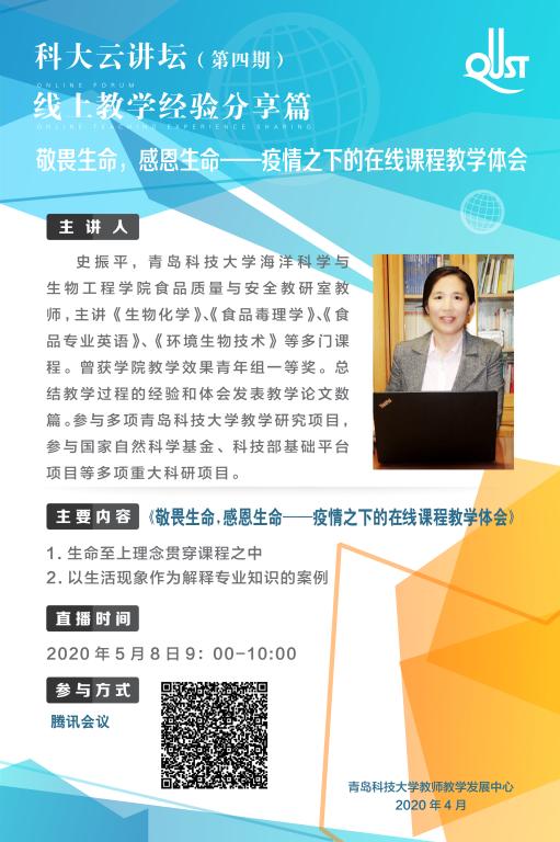 2020年5月8日上午9時(shí),海洋學(xué)院教師史振平在第“四期科大云講壇”開(kāi)展“敬畏生命,感恩生命——疫情之下的在線課程教學(xué)體會(huì)”經(jīng)驗(yàn)交流。史老師從“在課程過(guò)程中貫穿生命至上理念、以生活現(xiàn)象作為解釋專業(yè)知識(shí)的案例、學(xué)生在課堂和課下交流及反饋情況”三個(gè)方面進(jìn)行了總結(jié)和交流。