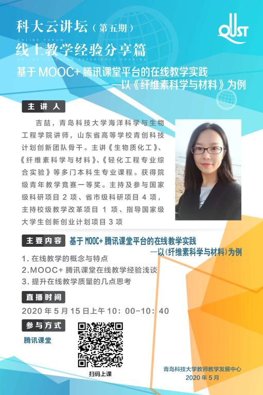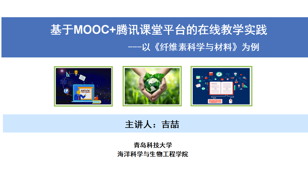 2020年5月15日上午10時(shí),海洋學(xué)院教師吉喆在第五期科大云講壇舉行了“基于MOOC+騰訊課堂平臺(tái)的在線教學(xué)實(shí)踐---以《纖維素科學(xué)與材料》為例”的經(jīng)驗(yàn)交流活動(dòng)。吉老師充分分析了在線教學(xué)的特點(diǎn)及優(yōu)勢(shì),結(jié)合講授的專業(yè)課程,對(duì)在線教學(xué)的思路設(shè)計(jì)做了充分講解,并針對(duì)“如何利用現(xiàn)有的MOOC和騰訊課堂直播平臺(tái),開展生動(dòng)有趣的在線教學(xué)”做了詳細(xì)匯報(bào)。最后,吉老師結(jié)合個(gè)人教學(xué)經(jīng)驗(yàn),對(duì)提升線上教學(xué)質(zhì)量的策略進(jìn)行了總結(jié)和交流。